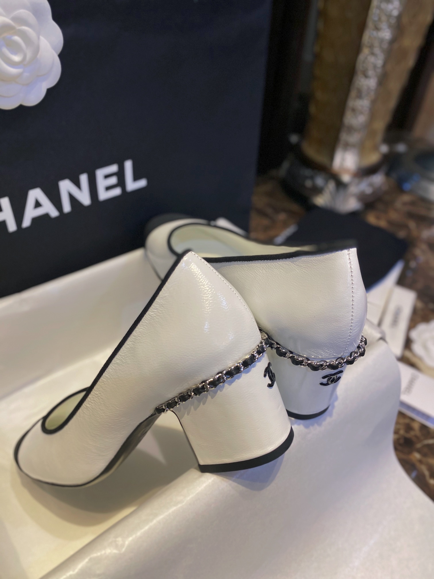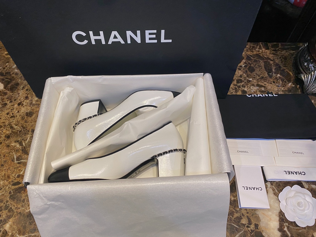 Chanel white chain high heels