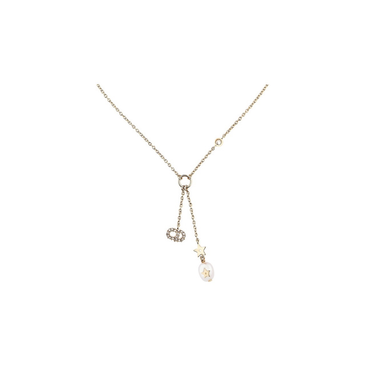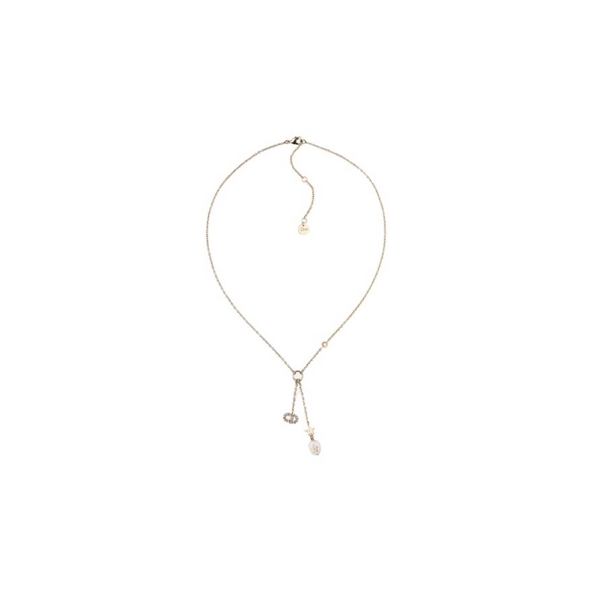 This necklace is from the Dior Destiny collection and is dated 2025. The slender gold-finished metal chain is adorned with two mother-of-pearl stars and the CD logo. The mother-of-pearl has a sophisticated sheen, creating a refined and elegant design that pairs beautifully with other pieces from the collection.