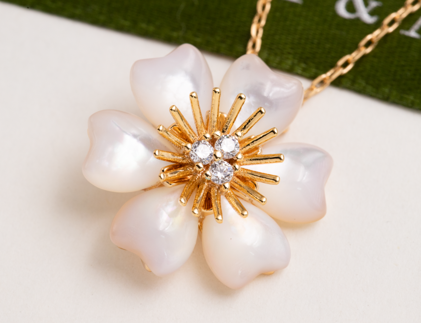 The petals are meticulously crafted from natural white mother-of-pearl, creating a smooth, translucent, rounded appearance. The vibrant centerpiece creates a vibrant, lifelike blossom! Using the latest craftsmanship, the necklace retains its color for an exceptionally long time.