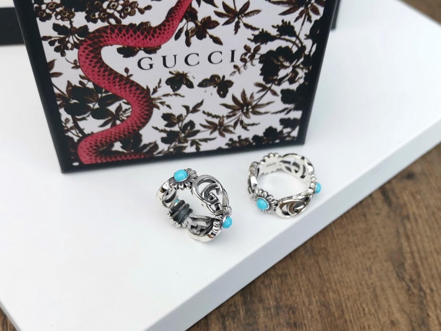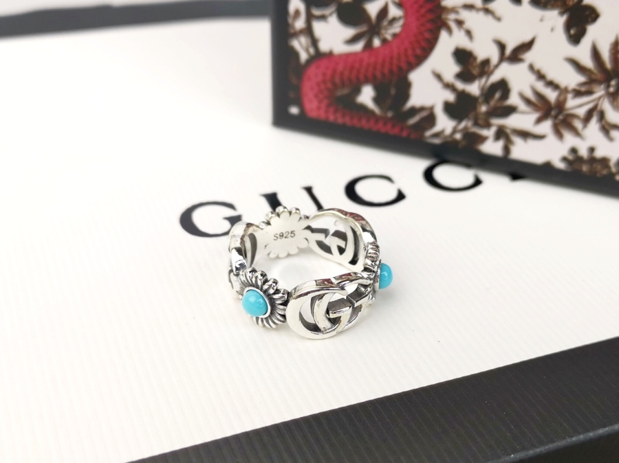 Made of silver with a distressed finish, the ring features Gucci's iconic Double G motif, interspersed with flowers.