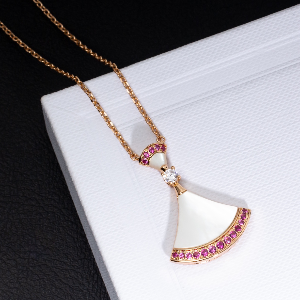 Inspired by feminine elegance and the allure of the Eternal City, the DIVAS' DREAM necklace celebrates the most captivating women with a distinctly Roman spirit. Intensely feminine and refined, this necklace captures the captivating curves of the magnificent fan-shaped mosaics of the Caracas Baths marble, embodying the true essence of Italian aesthetics.