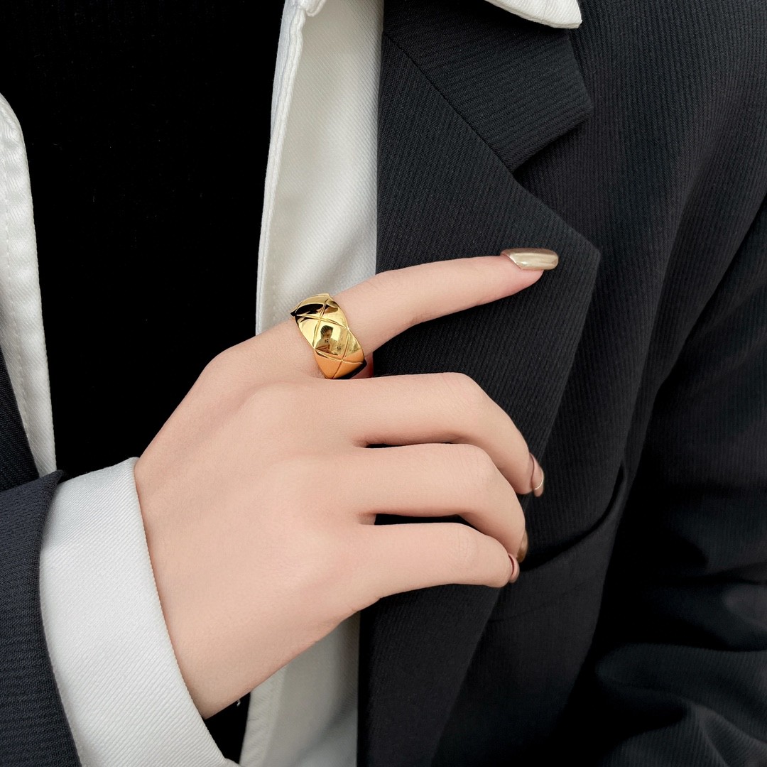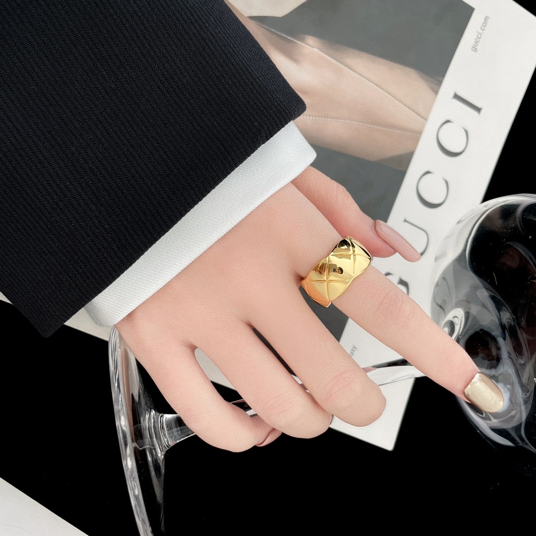Inspired by Chanel's first watch, the ring design combines the square shape of the watch with the double C logo. Usually made of gold, it presents an elegant and sophisticated style.