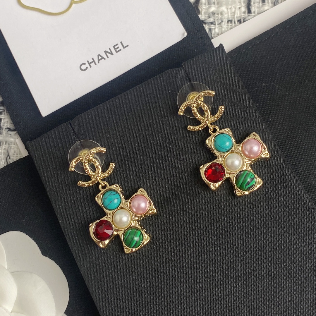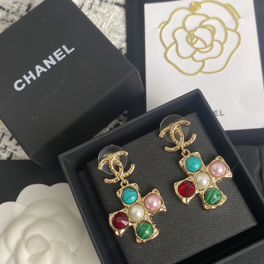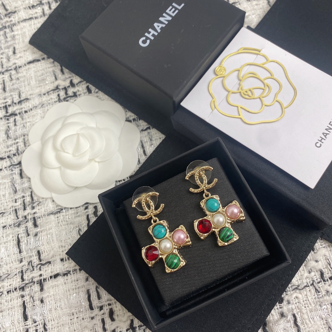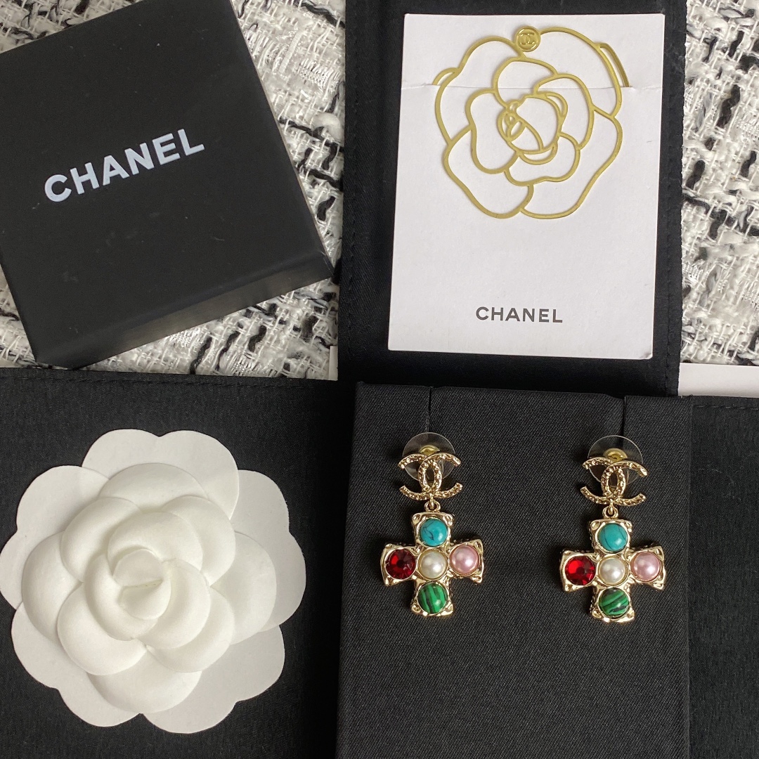 Chanel's new 24-inspired cross-shaped glass pearl earrings feature a light gold hue. Perfect for everyday wear, these earrings offer a retro, modern, and sophisticated look.