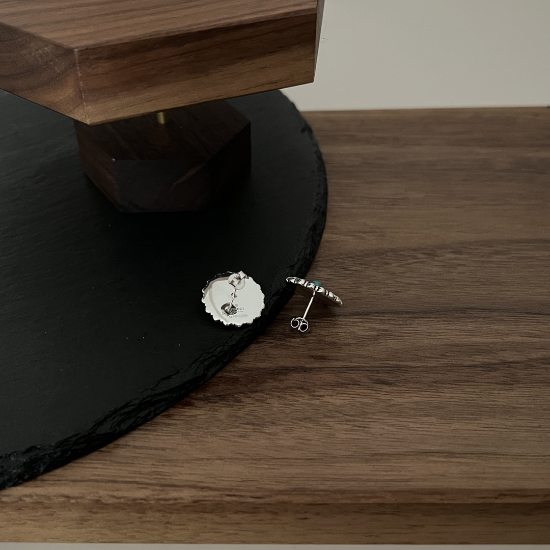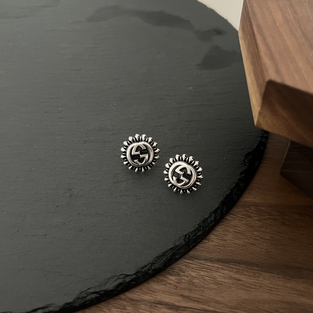 One of these earrings features a classic double G pattern, while the other is a flower shape. The distressed material is exquisite and vintage.