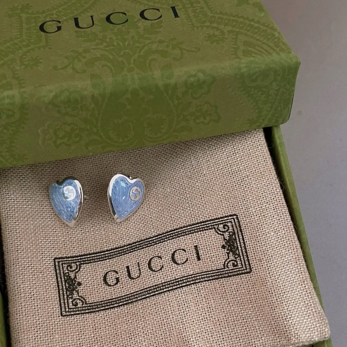 With a heart shape as the background, the interlocking double G pattern with a hollow effect is made of light blue enamel. The heart is decorated with engraved details. The combination of exquisite and complex details and transparent techniques shows a unique sense of fashion.