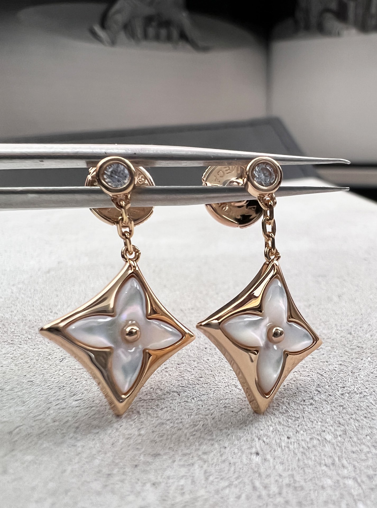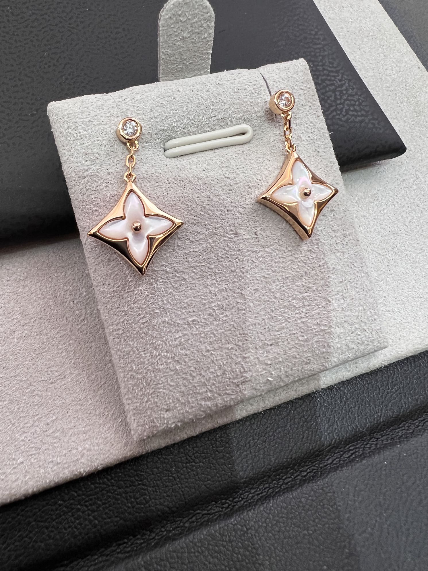 Color Blossom BB series white mother-of-pearl three-dimensional flower earrings are inspired by the classic Louis Vuitton monogram pattern. With the background of sparkling zircons, a delicate and beautiful flower blooms on the natural mother-of-pearl with a dazzling light pink gold light.