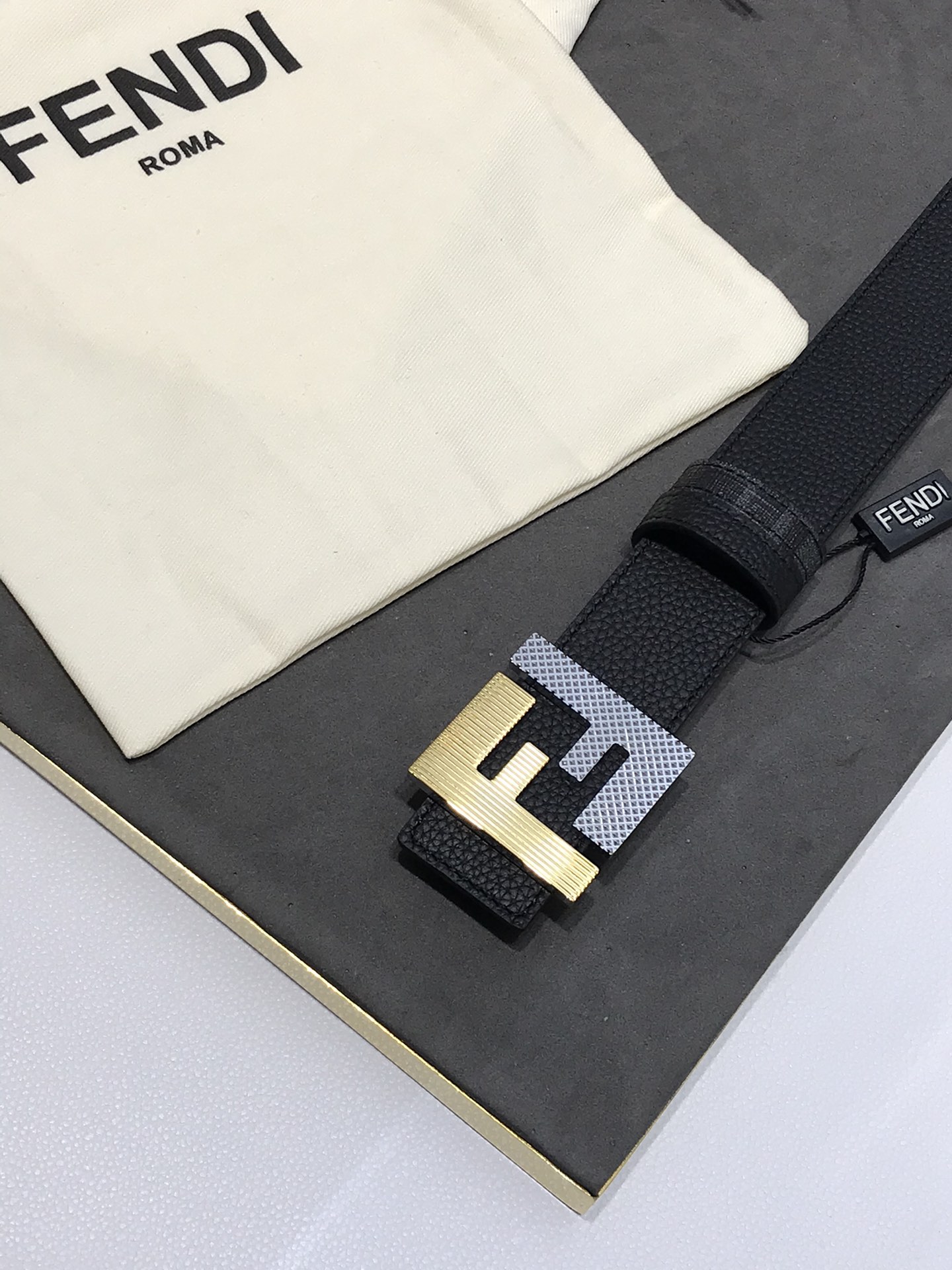 Fendi's new FD belt is 35MM wide and features a logo design, a two-tone patterned F rivet buckle, original monogram-made, and gold-plated metal.