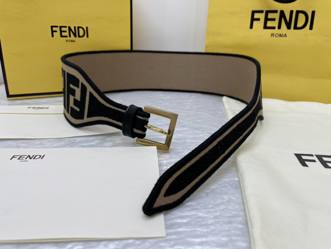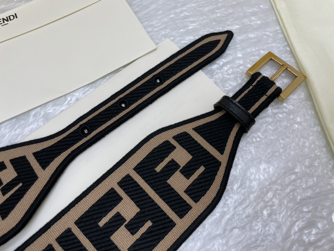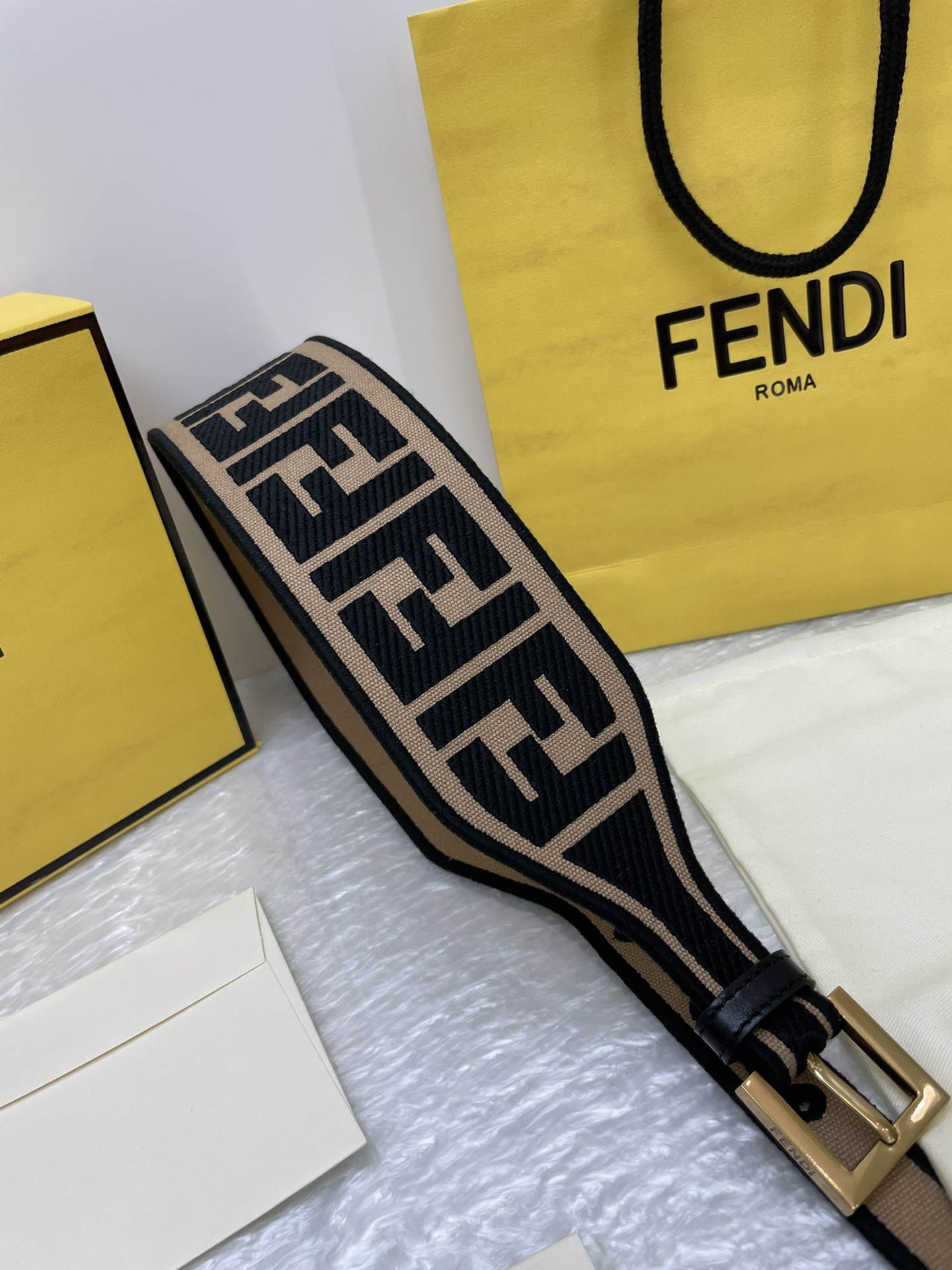 Fendi's new embroidered belt features a wide FF logo and buckle detail. 6cm wide.
