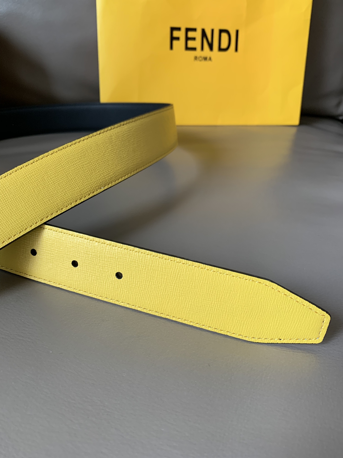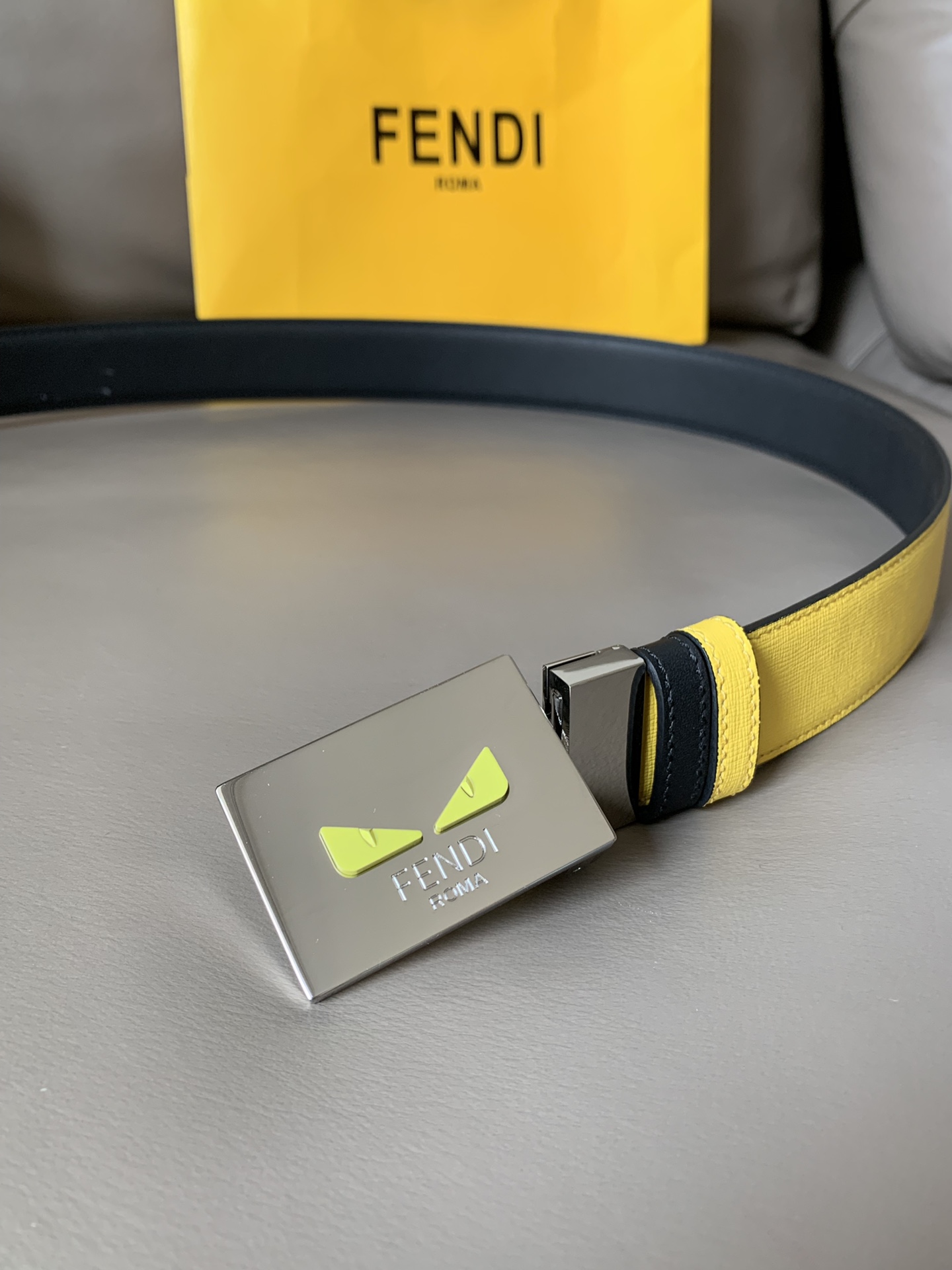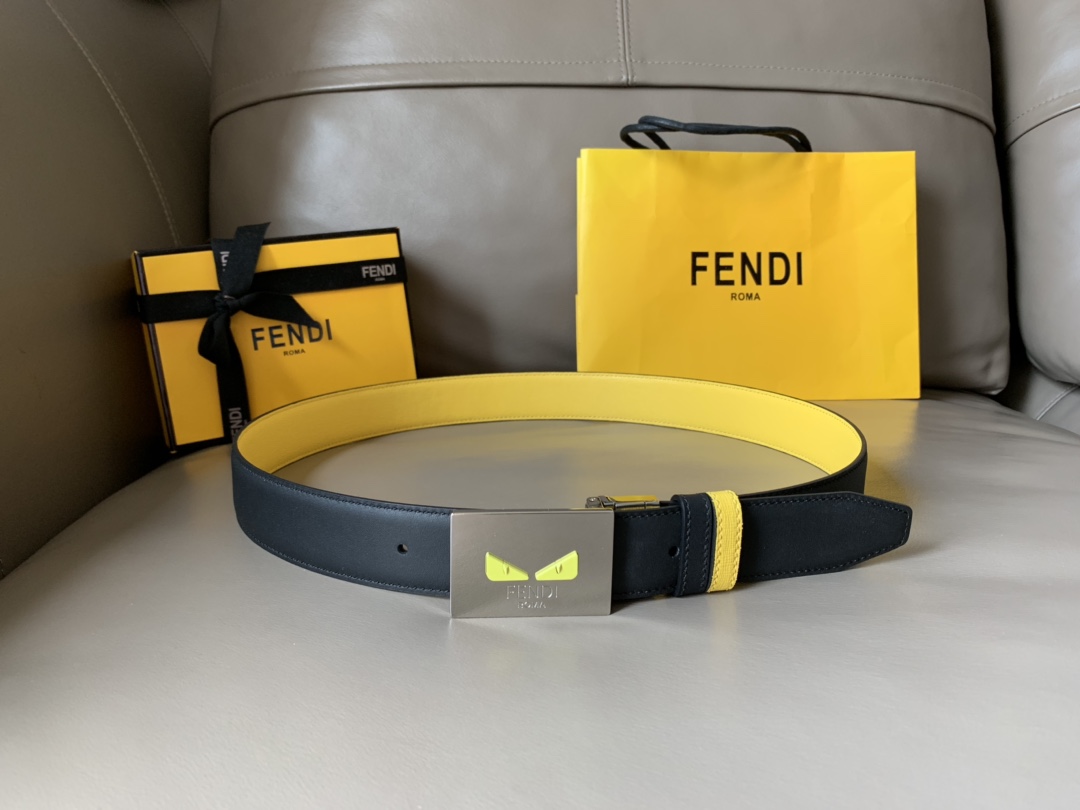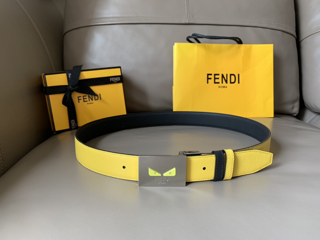 Fendi casual reversible belt, one side yellow, one side black, 34MM wide, palladium finish buckle and I See You eyes, unique and fashionable casual style.