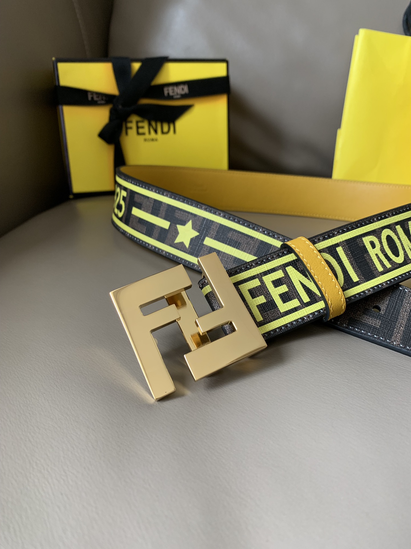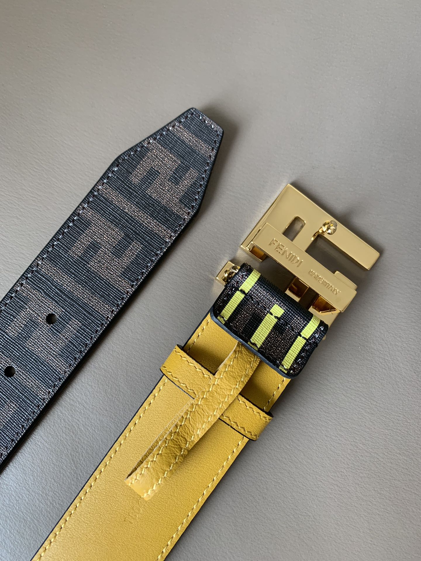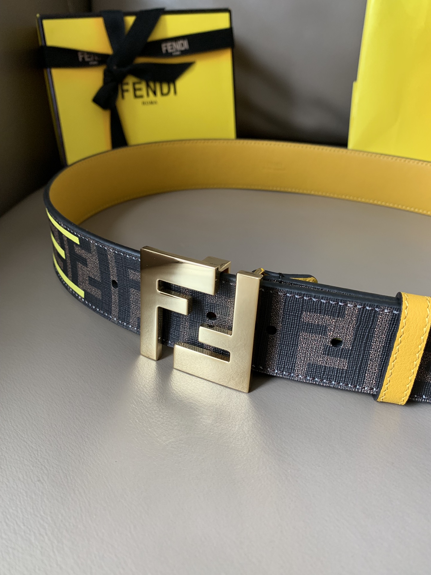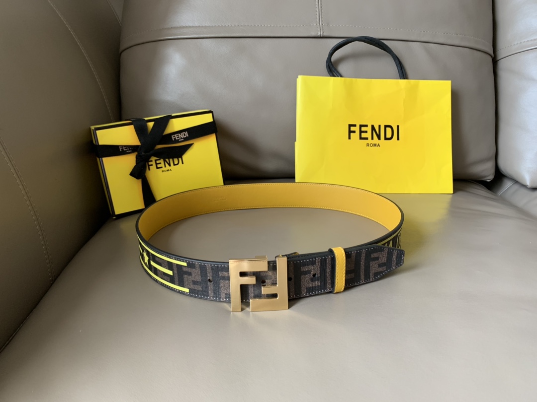 Fendi men's casual fashion belt, 4.0cm wide, made of canvas, with iconic brown F pattern and FENDI print, yellow lining and shiny metal F buckle, fashionable and individual.