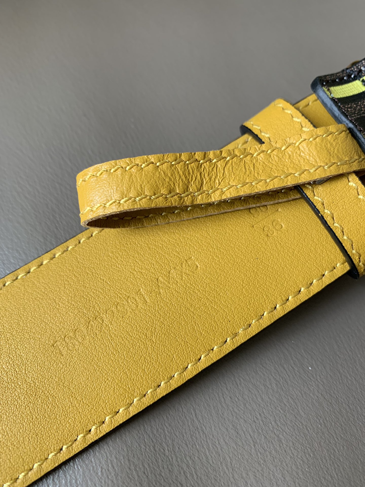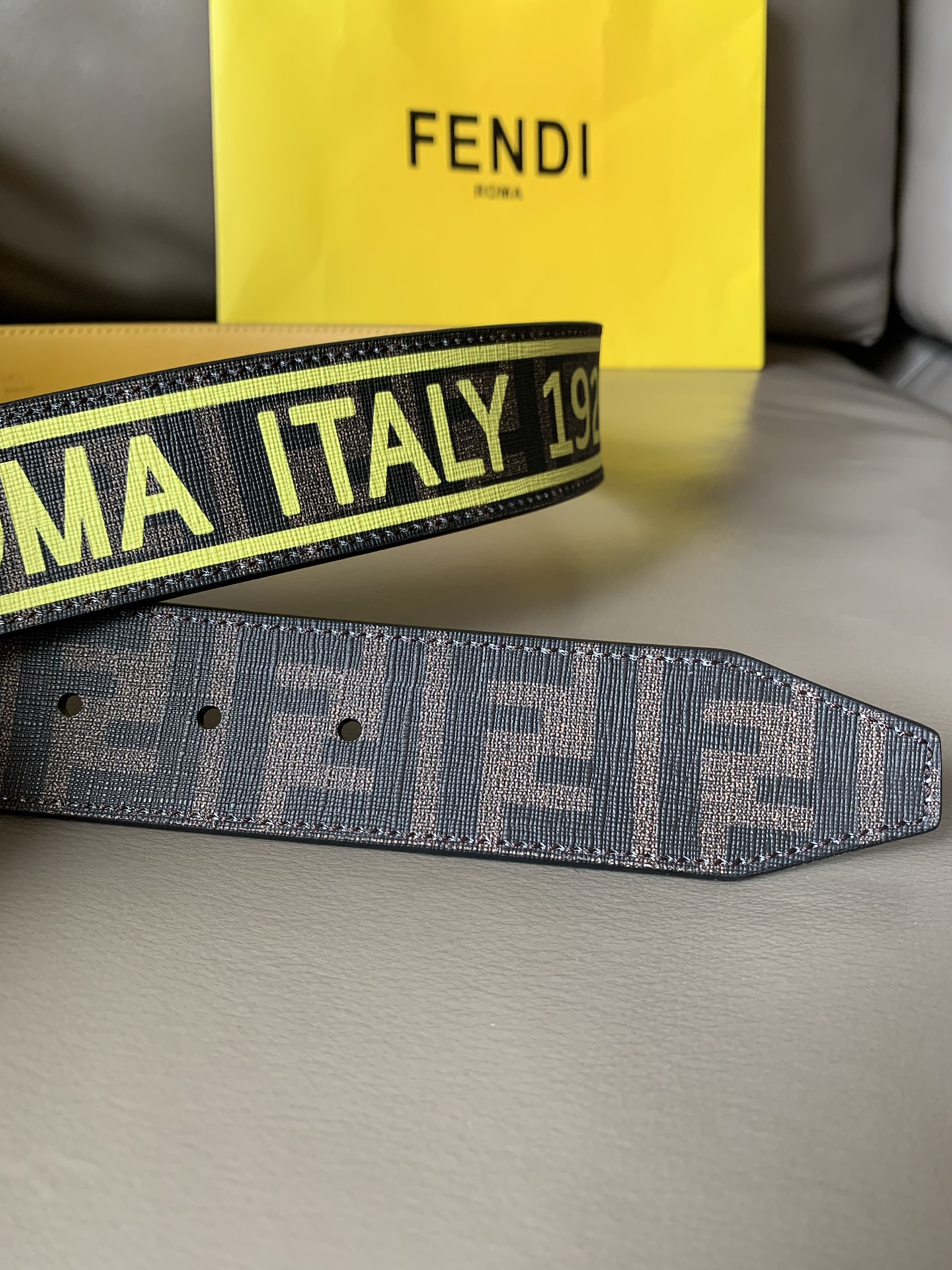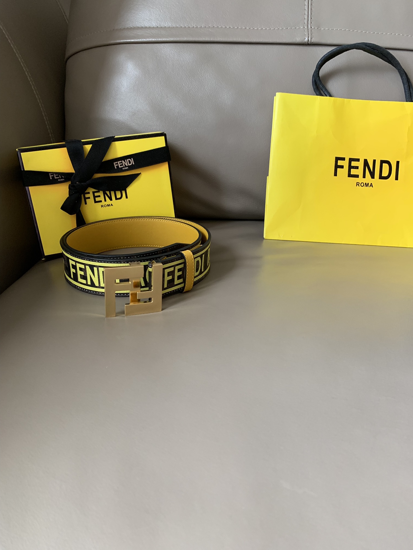 Fendi men's casual fashion belt, 4.0cm wide, made of canvas, with iconic brown F pattern and FENDI print, yellow lining and shiny metal F buckle, fashionable and individual.