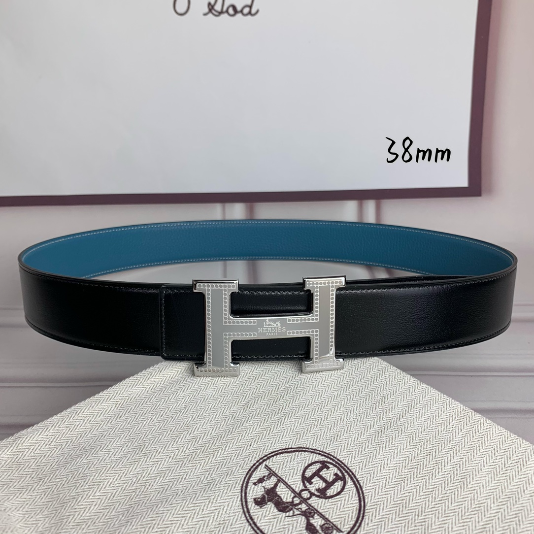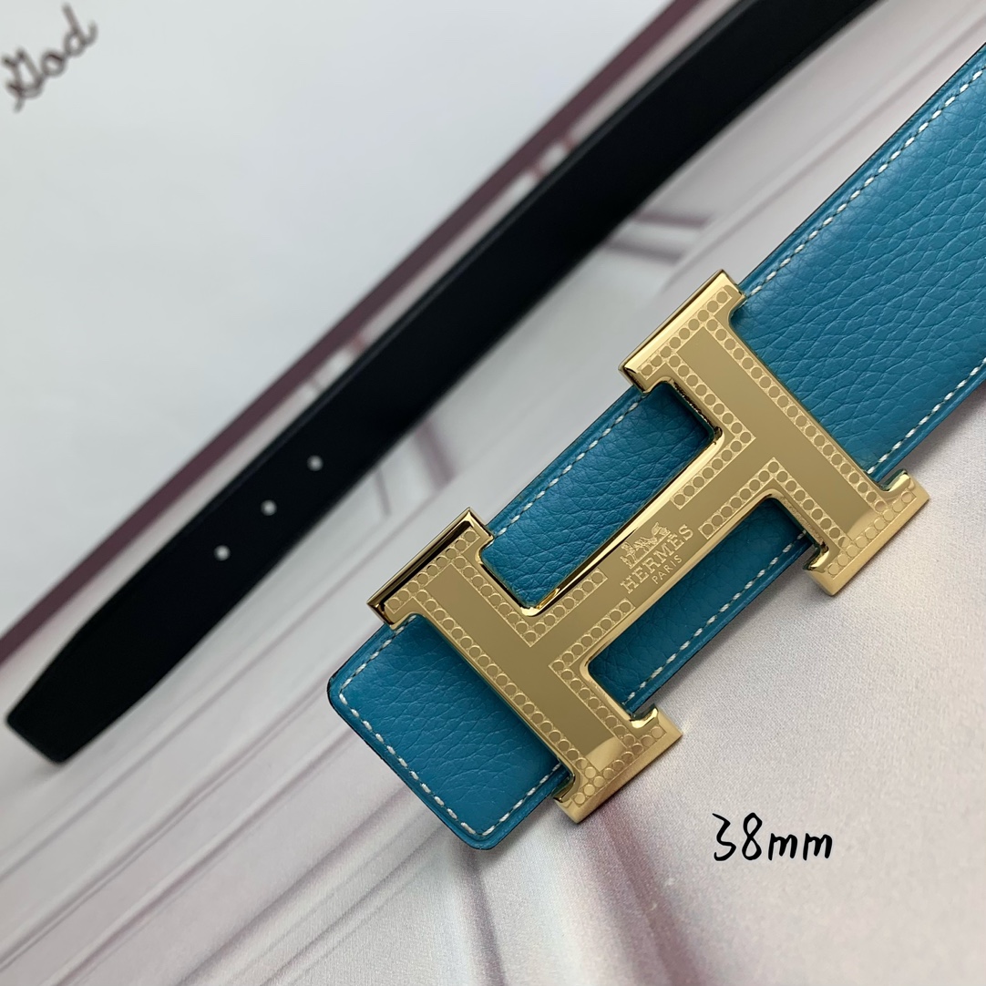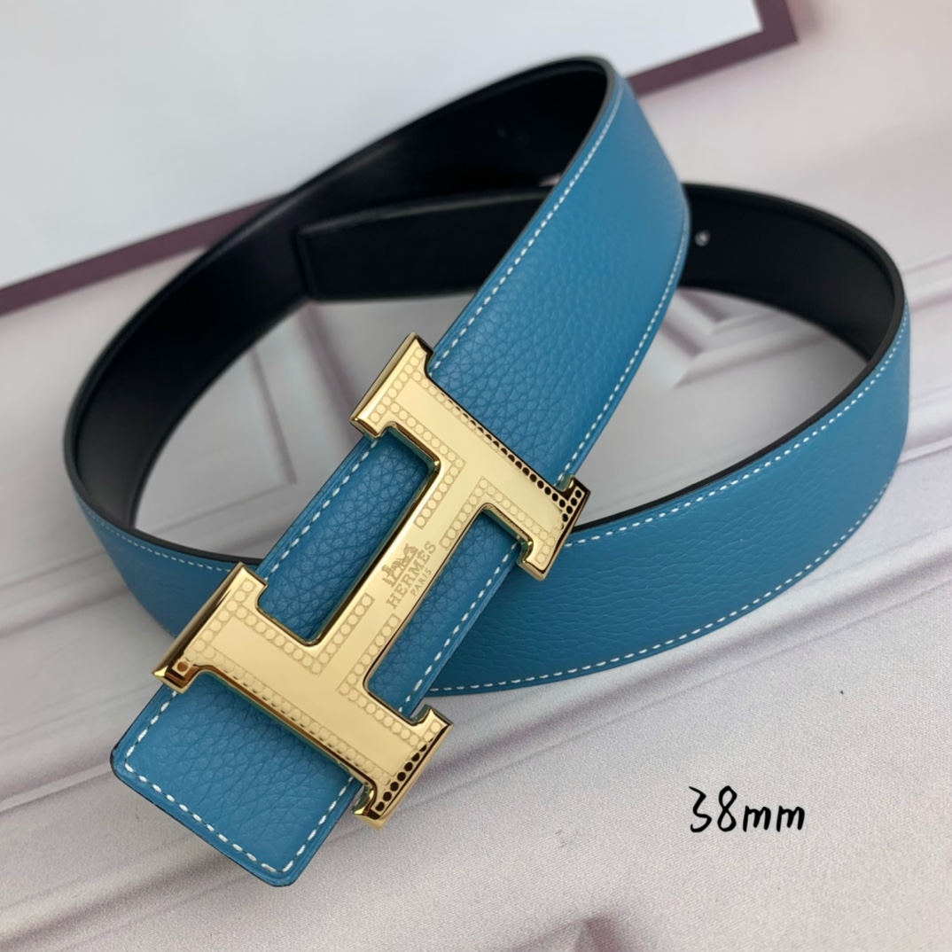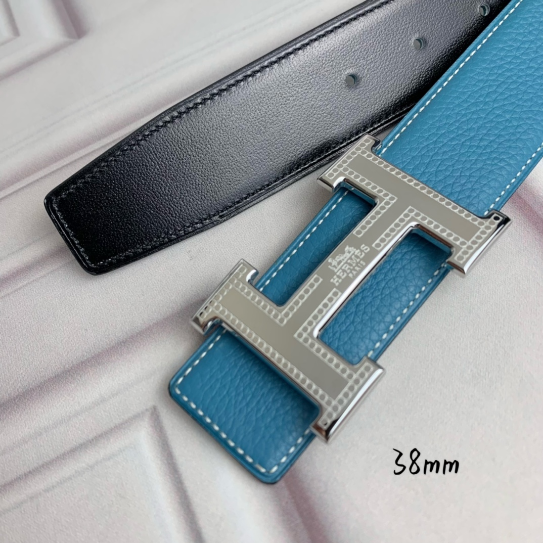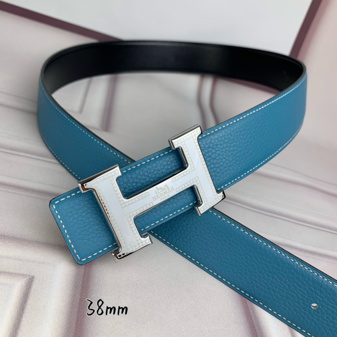 Hermè s classic flat-headed double-sided medium blue lychee white line with black plain inch and a half 38mm with H glossy gold/silver buckle.
