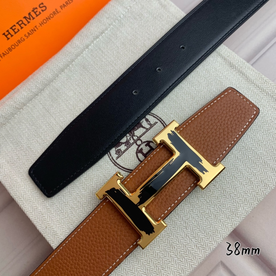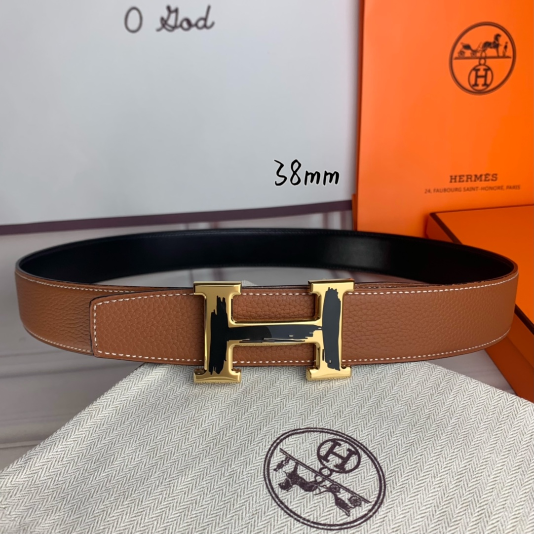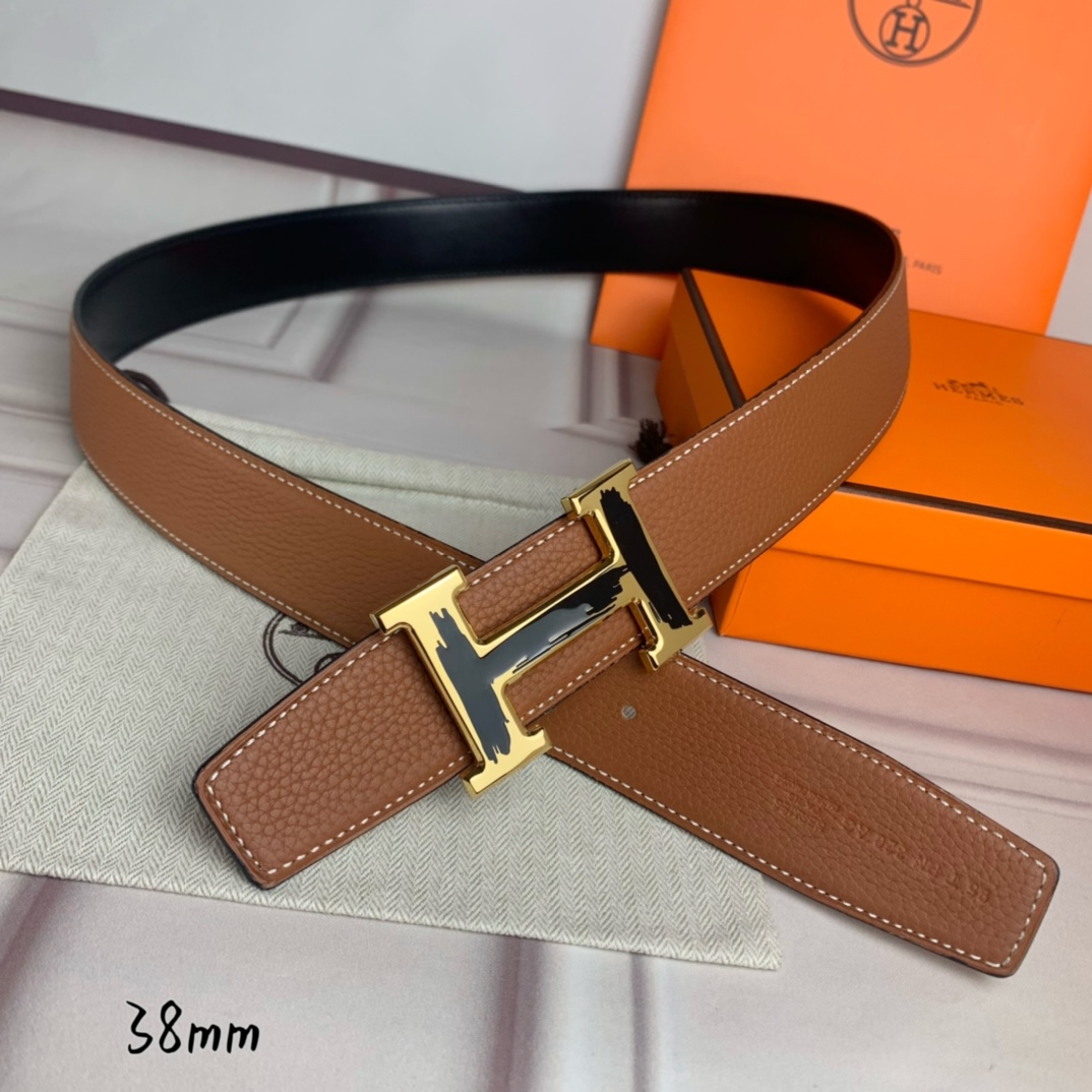 Hermès Hermes double-headed eight-character gray lychee pattern with black plain pattern inch and a half 38mm with double H graffiti glue drop gold black/silver black/silver blue buckle.