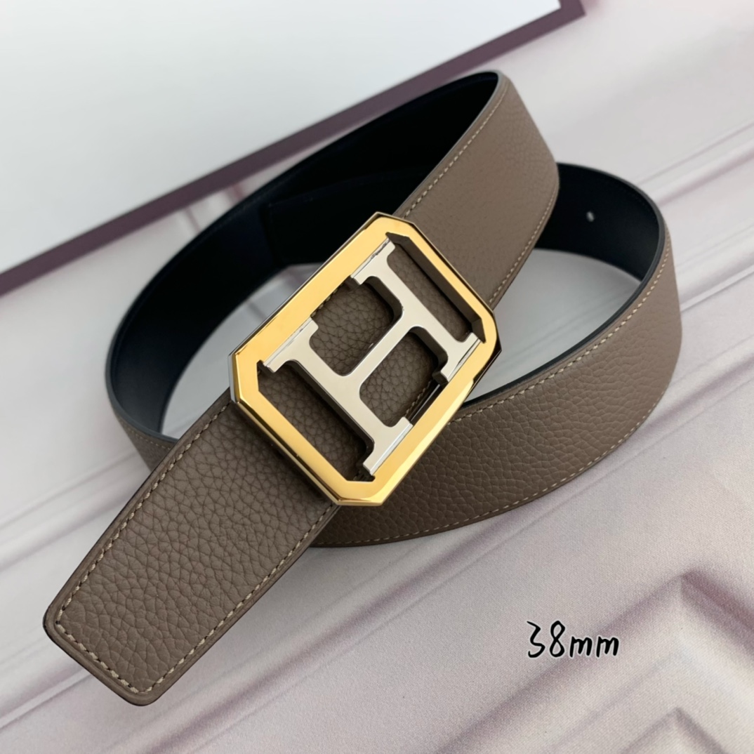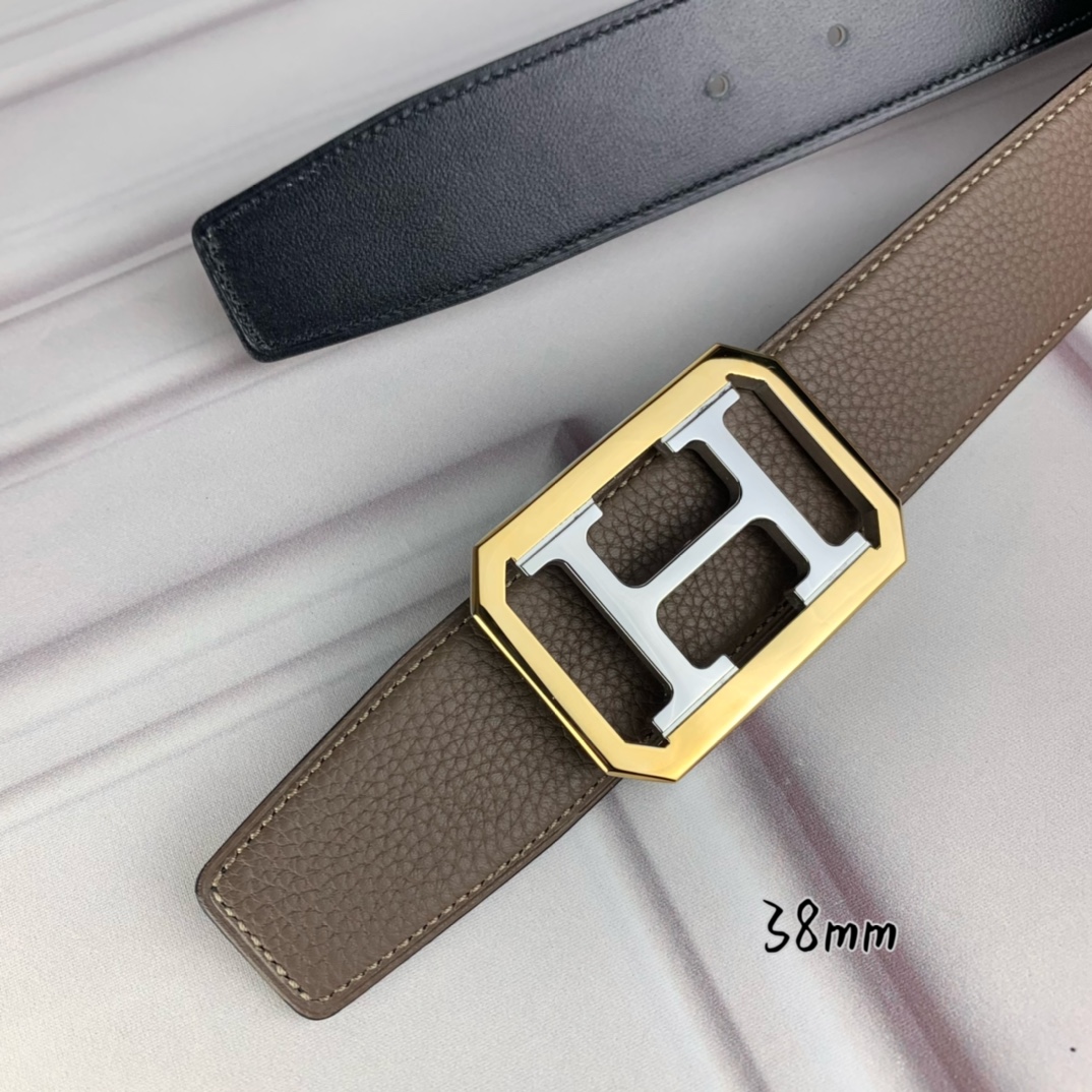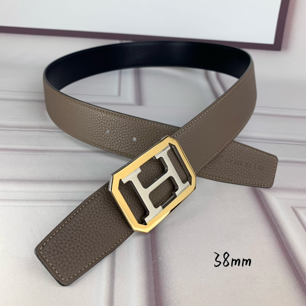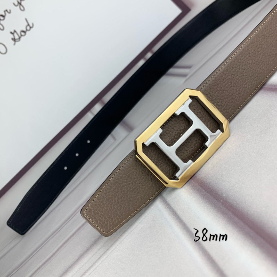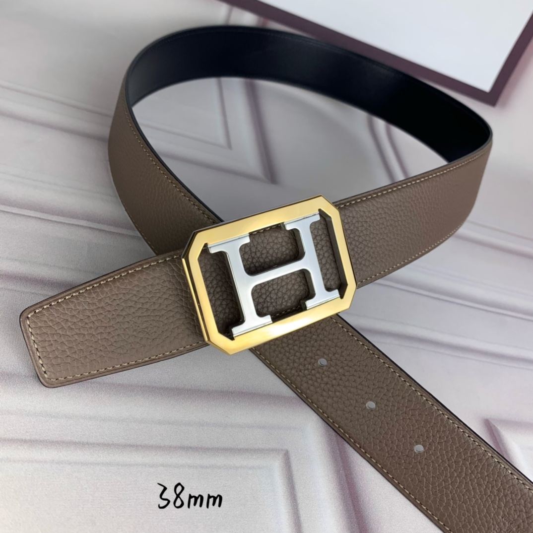 Hermès Hermè s double-headed pointed gray lychee pattern with black flat inch and a half 38mm with intermediate color silver H gold frame buckle.