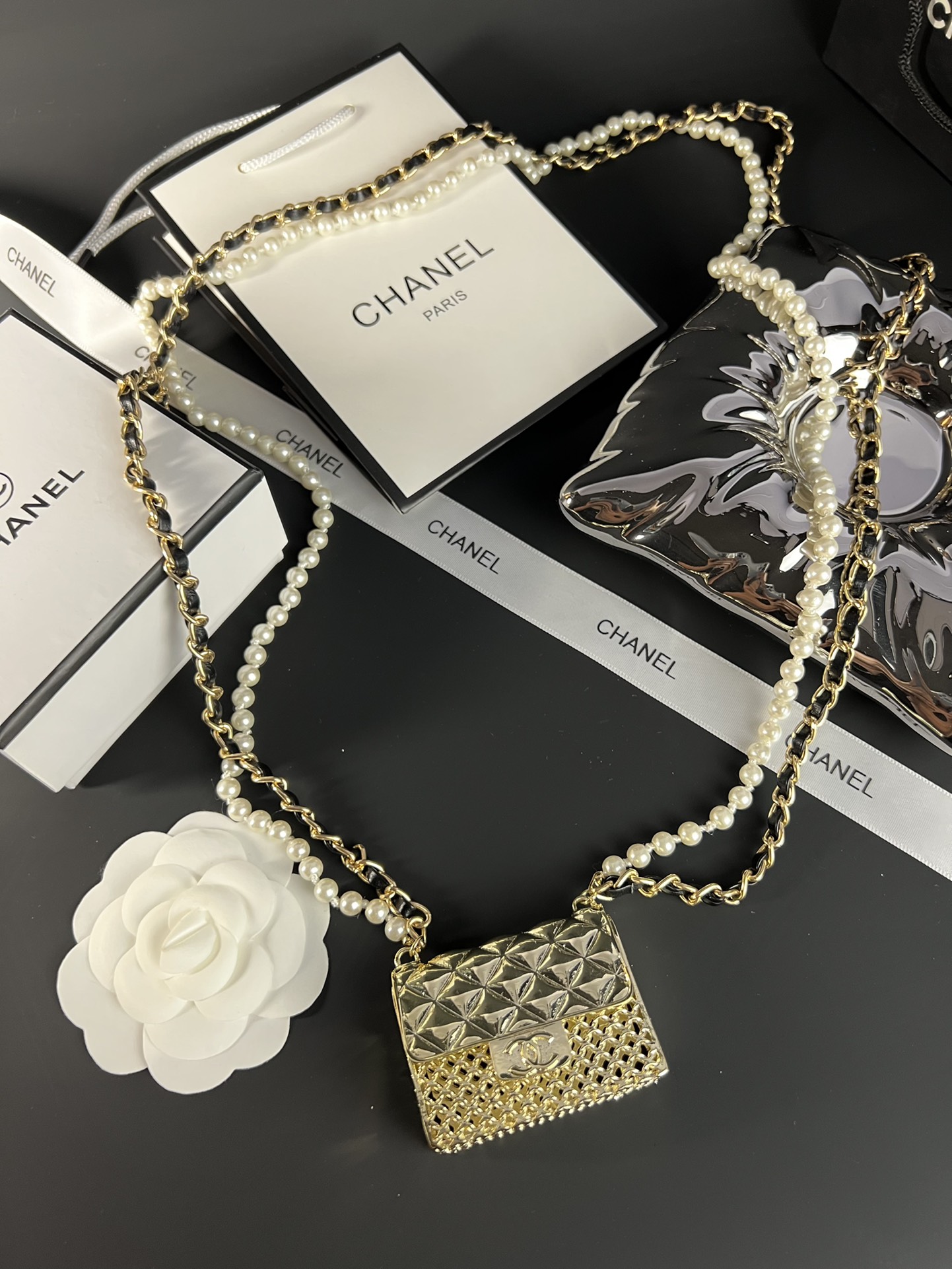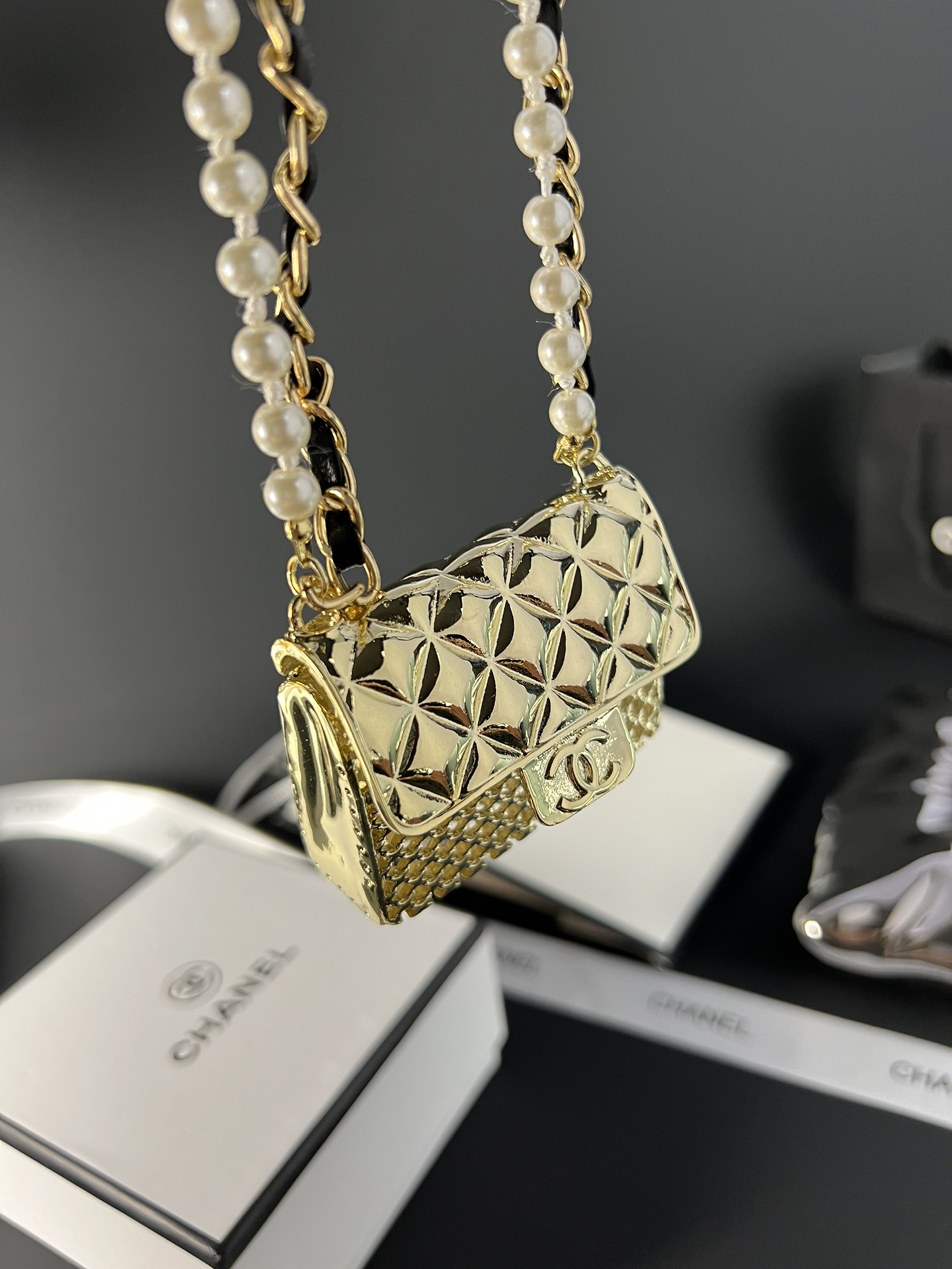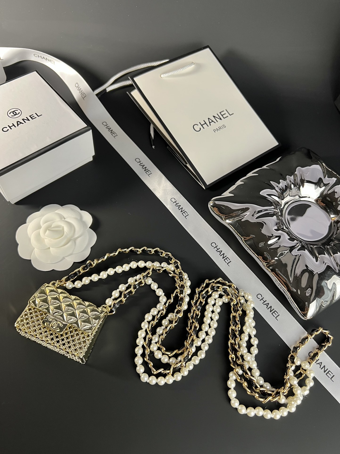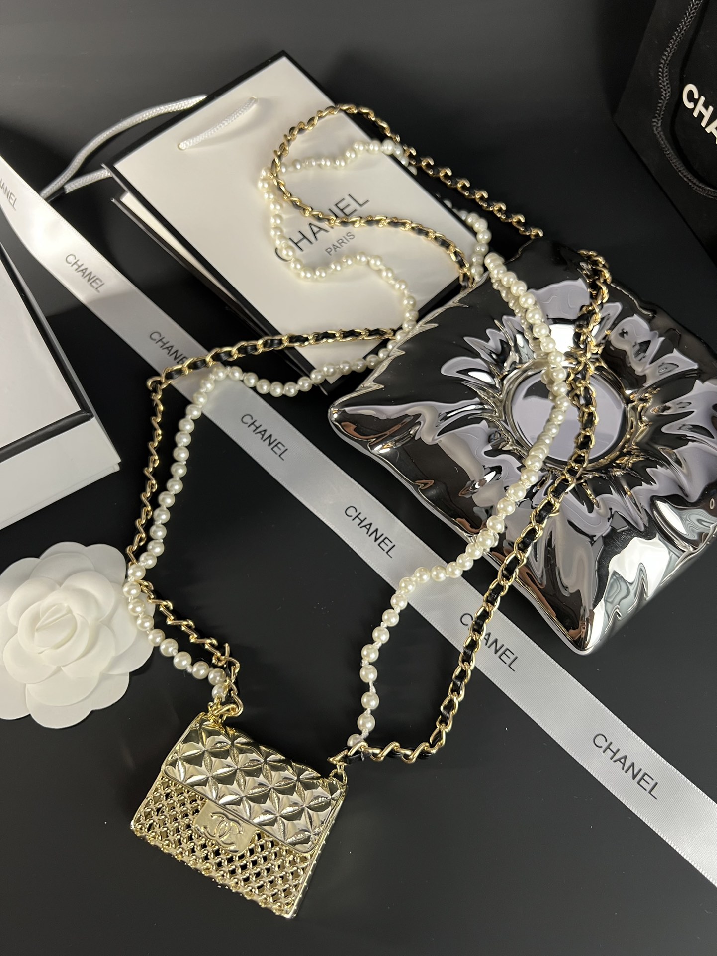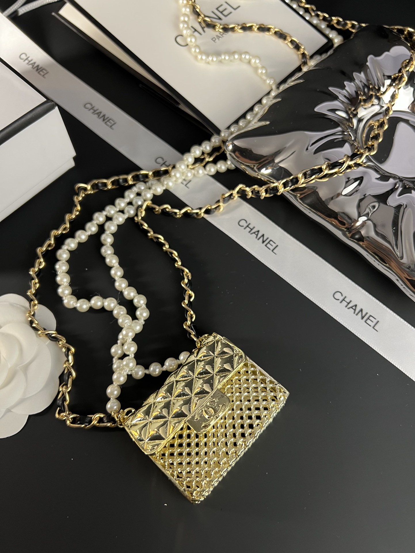 Chanel mini pearl + leather chain bag necklace, small bag, palm size, metal hollow design, very delicate and cute