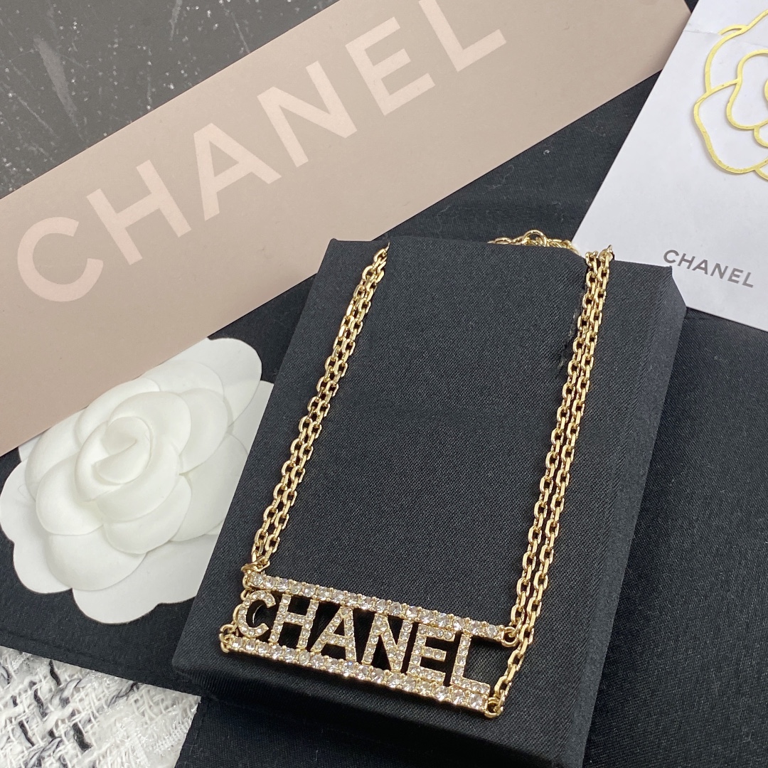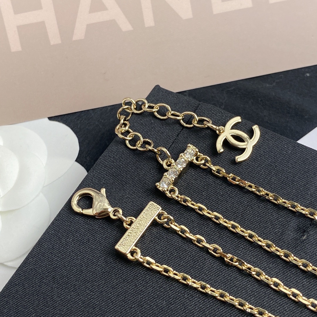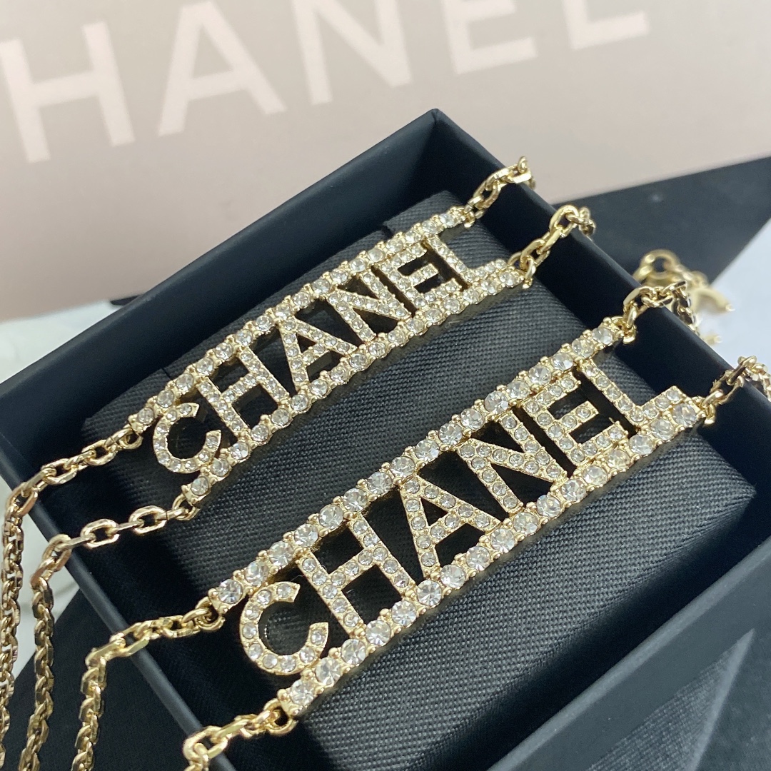 Chanel's new diamond-studded alphabet necklace. Featuring a light gold hue, it's versatile and easy to wear. This retro, modern, ladylike necklace is minimalist yet sophisticated.