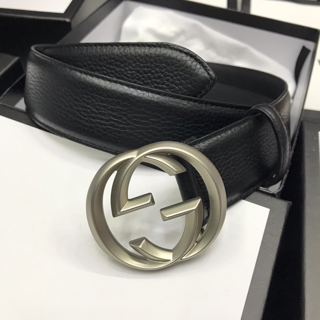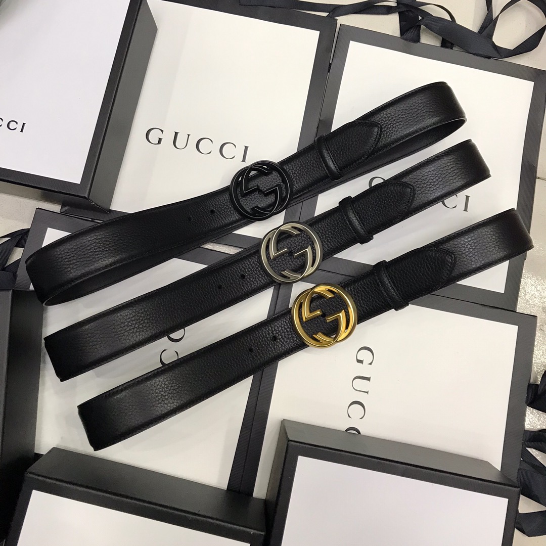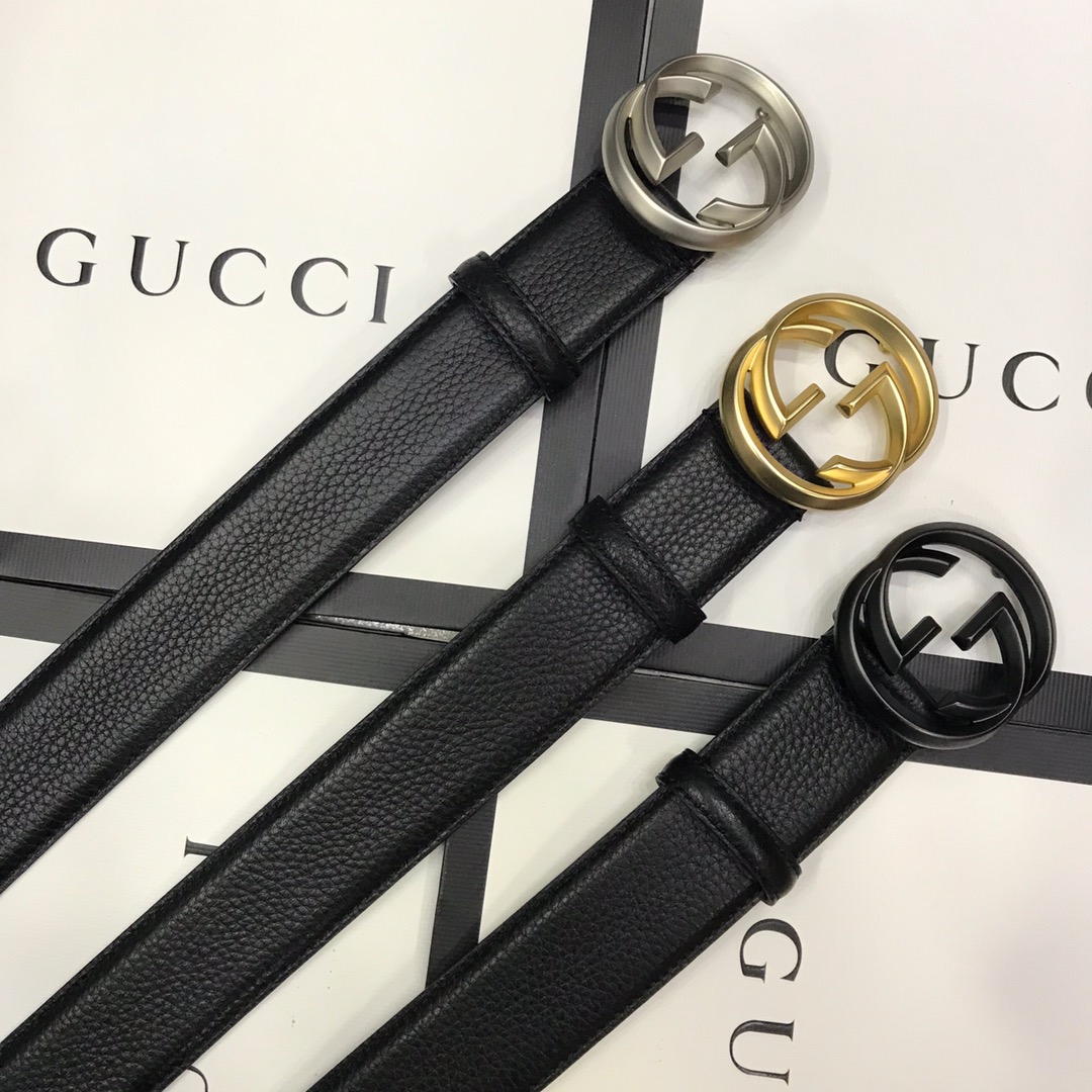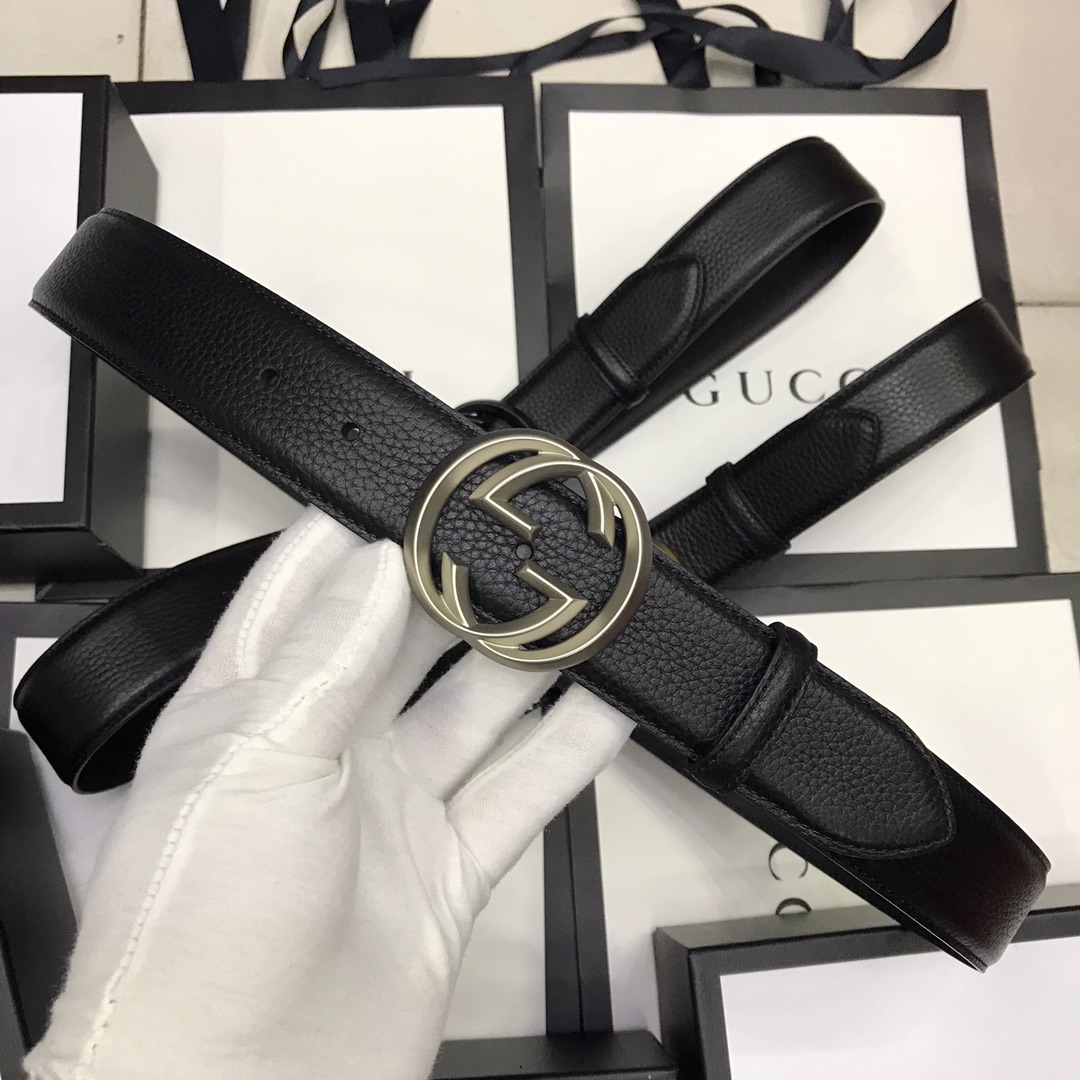 Gucci 2020 Gucci fashion bestseller Color: Black, Size: 3.8cm, the belt body is made of textured top layer leather with a new GG interlocking polished brass metal buckle.