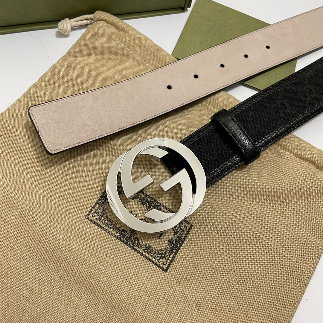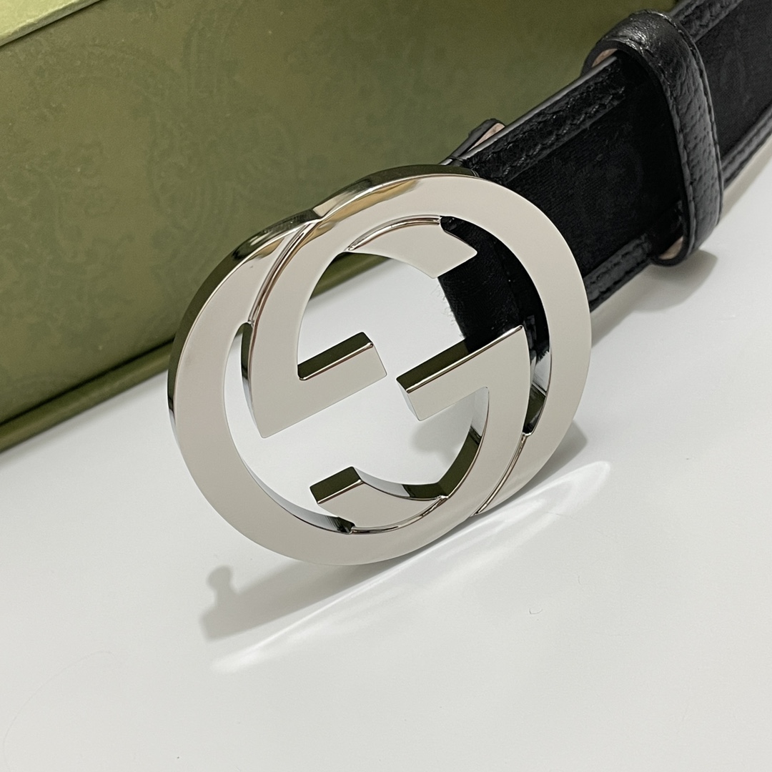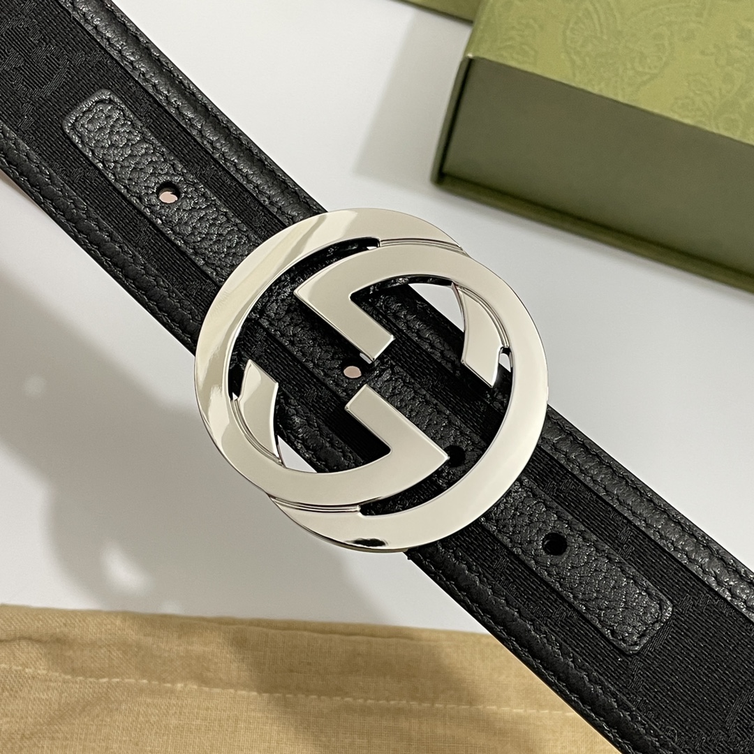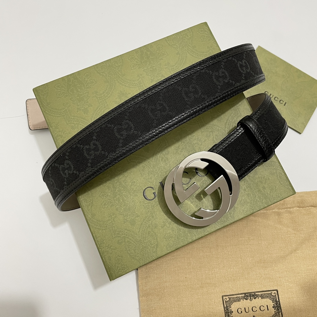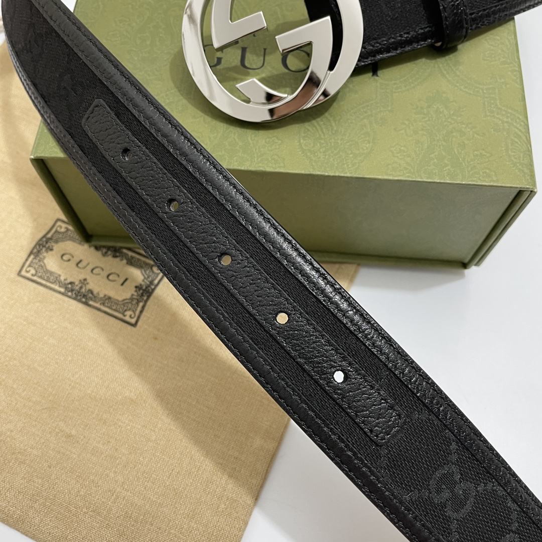 Gucci 包边款, 黑色G花帆布头层野猪纹包边,内衬头层变色磨砂底 宽4.0cm 双G扣